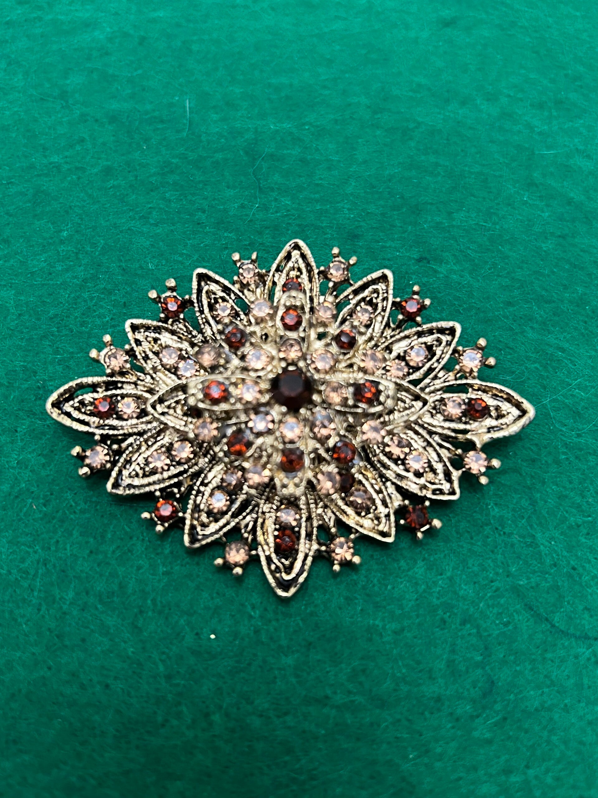 Beautiful gold toned brooch with amber toned rhinestones